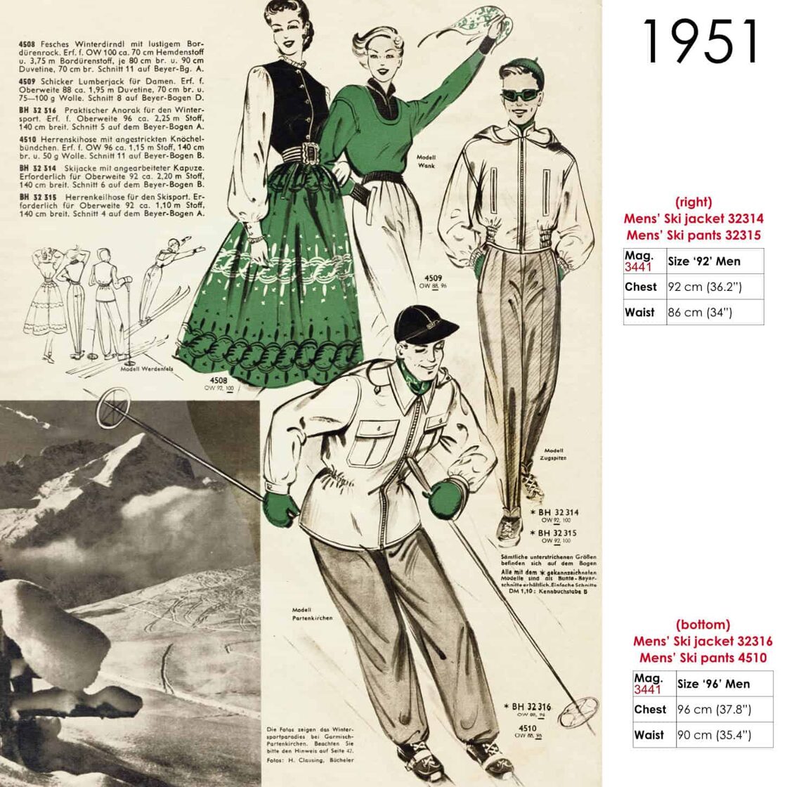 Drawing of 1950s ski clothing patterns -