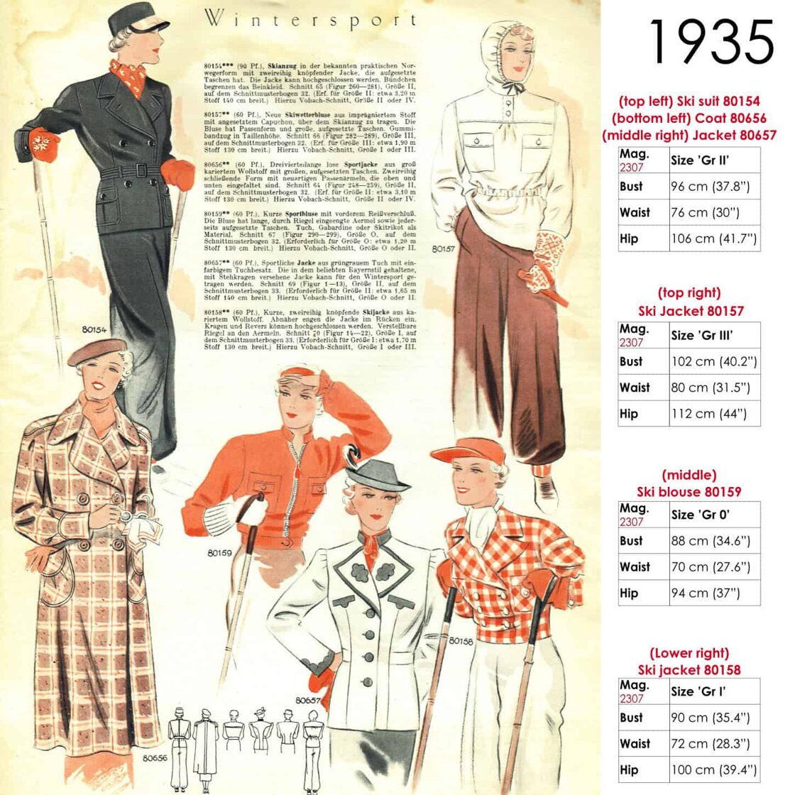 Original sketches 1935 skiwear sewing patterns -